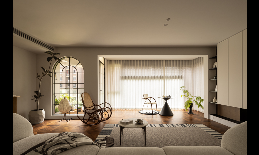 三、实际应用:从空间到功能的融合实践公共区域:开放与包容客厅:低矮家具(如地台+蒲团)降低重心,墙面留白搭配艺术漆纹理,中央以暖光吊灯聚焦视觉。咖啡/休闲区:弧形背景墙+伊姆斯躺椅,结合业主手作插花,传递温暖与亲和力。私密空间:静谧与归属感卧室:悬浮床设计+L型衣柜整合储物,床头藤编元素呼应自然,浅色艺术漆营造安宁。卫生间:水泥砖墙+雾面瓷砖,线形灯勾勒轮廓,质朴中隐含现代质感。特殊处理:隐与显的辩证隐形门:消弭门框存在感,延续极简视觉;多功能区:如开放沙龙区配备可升降隔帘,兼顾私密与共享;户外花园:遮阳结构与绿植结合,打造“城市桃源”,强化自然体验。四、精神内核:超越设计的生命美学