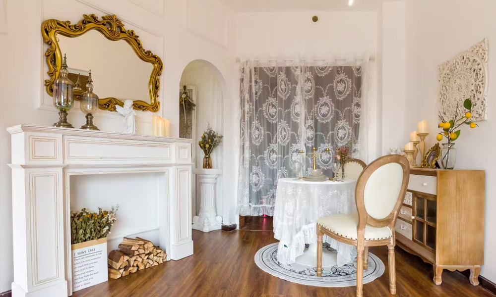 - **灯光与氛围**:暖色吊灯(如复古玻璃灯罩)搭配烛台,营造暧昧光影。