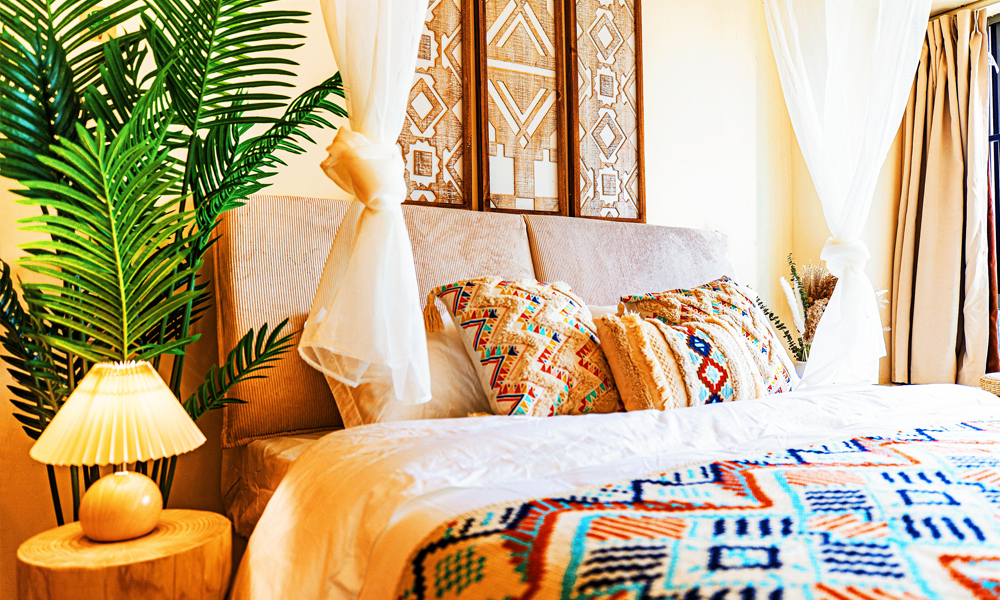 - **自然元素**:悬挂干花或藤蔓装饰,床头摆放陶土盆栽,增强自然气息。