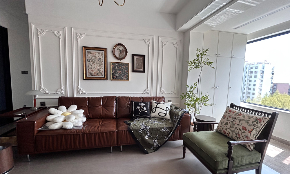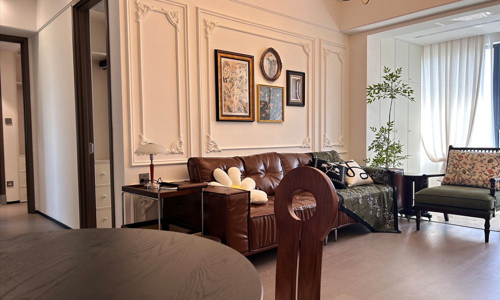 - **客厅**:沙发组合采用“L型+单椅”布局,中央茶几保留低矮设计,保持视觉轻盈。背景墙用浮冰白石膏线勾勒法式护墙板,悬挂复古铜框镜或艺术画。