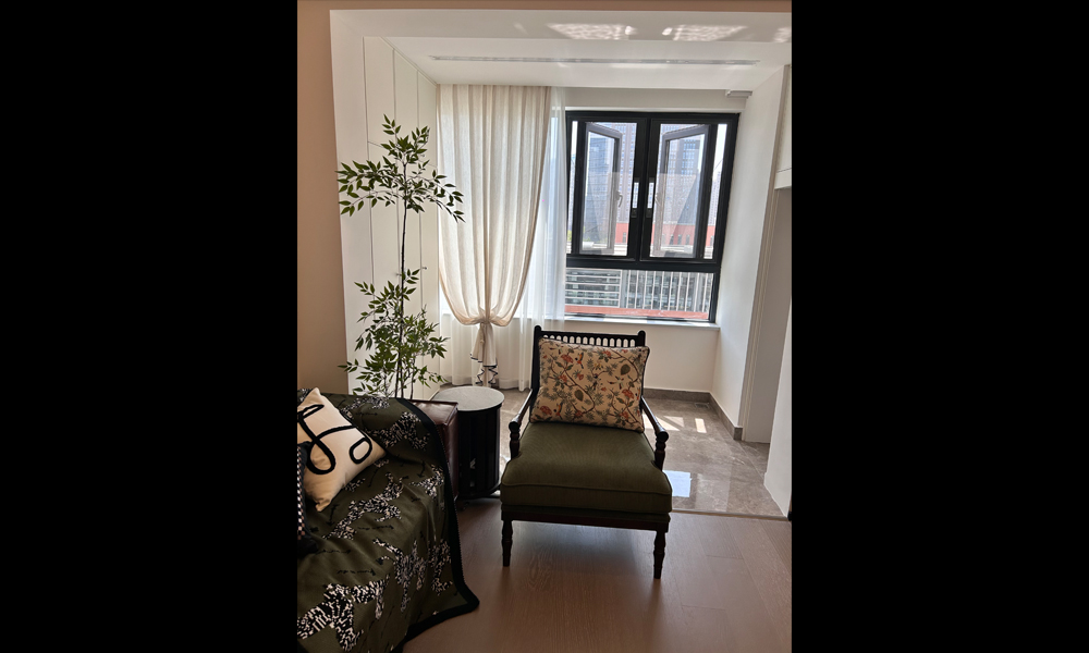 - 阳台融入休闲区,与客厅连通扩大视野,用绿植与抽象画增添自然艺术气息。
