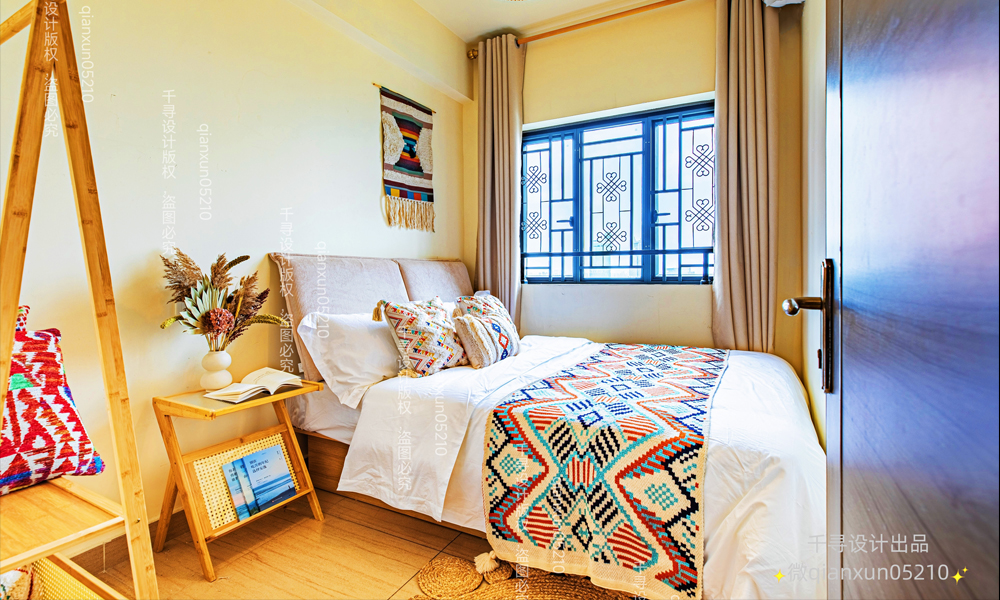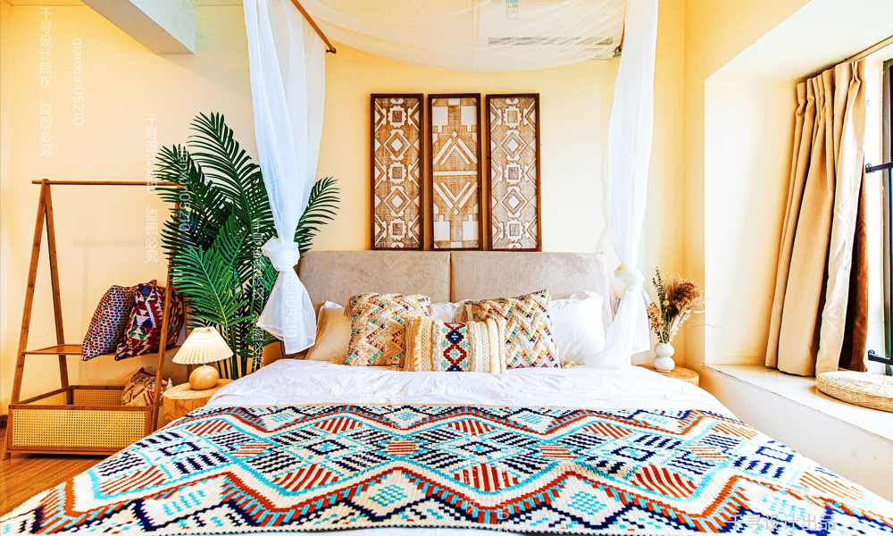 - **床品与窗帘**:垂坠感强的碎花或条纹床幔,搭配流苏边饰,窗帘选用透光纱+民族印花层叠。