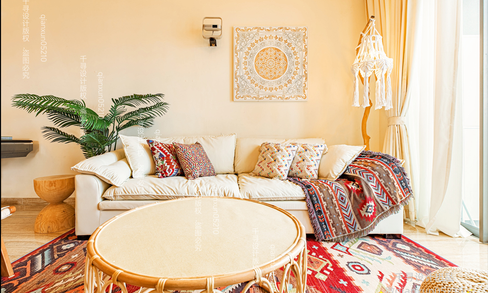 - **艺术品点缀**:民族风挂毯、手工绘画、复古铜器、编织地毯等,强化文化融合感。